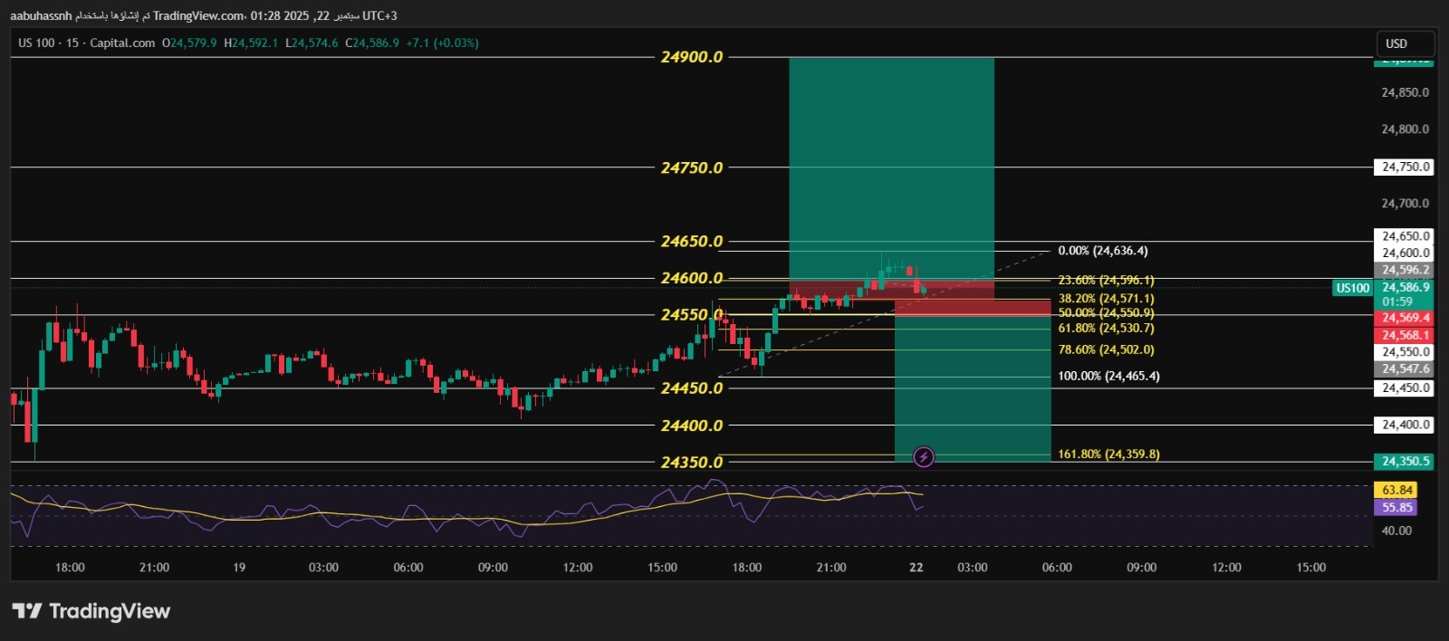 النظرة العامةيتداول مؤشر الناسداك حالياً عند مستوى 24,588 داخل نطاق فني محوري، حيث تتركز أنظار المتداولين حول المنطقة (24,550 – 24,600) والتي تُعد نقطة مفصلية لتحديد الاتجاه القادم.الثبات أعلى هذه المنطقة يعزز من الزخم الصاعد لاستهداف قمم جديدة، في حين أن الكسر الواضح دونها قد يُفقد المؤشر زخمه ويفتح المجال أمام حركة هبوطية أوسع. المستويات […]
